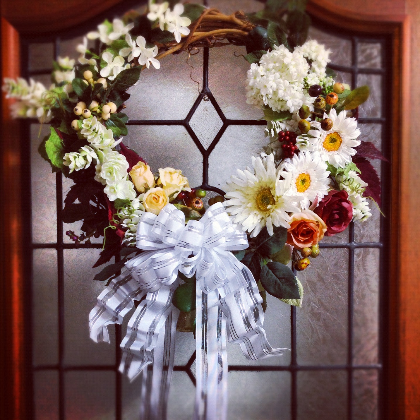 去年のリースは、リボンを沢山つけて玄関へ。