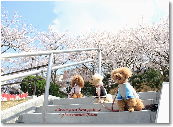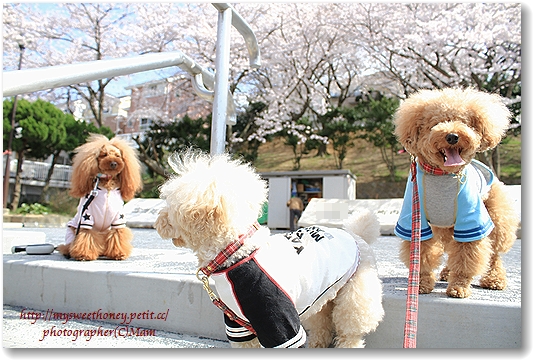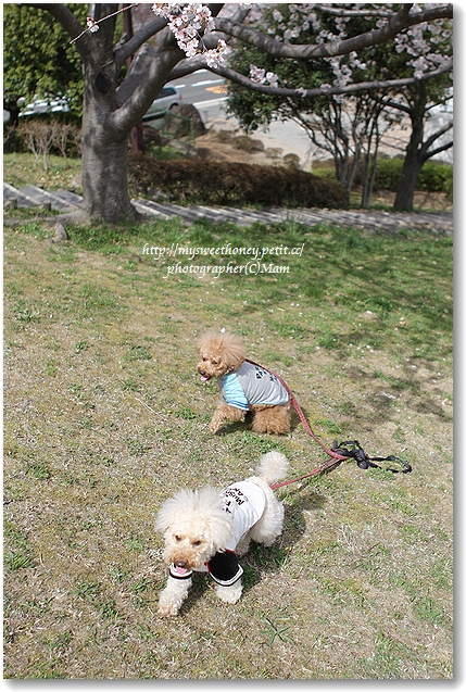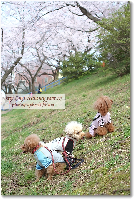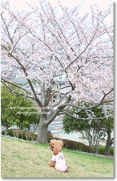 青空にピンクの桜が満開で風もなく温かなお花見日和で、ワンズも私たちも存分に楽しみました。