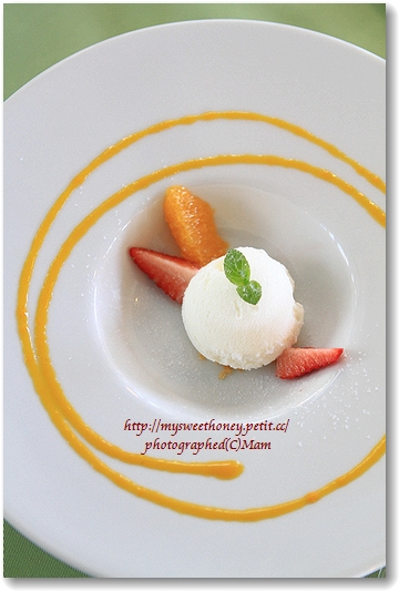 ソースのオレンジとイチゴの赤がとても可愛くて、テーブルクロスのグリーンもキレイで