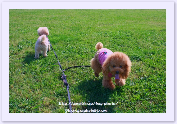 芝生まで行ったら、ショルダーリードを肩から外しジーンズのベルトに引っ掛けて