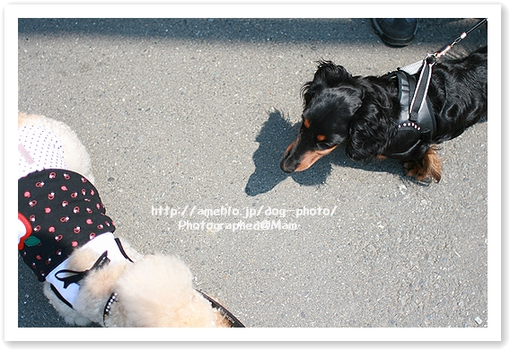 ベンチに腰掛けてた飼い主さんの足元にいたダックスちゃん。