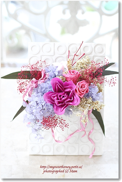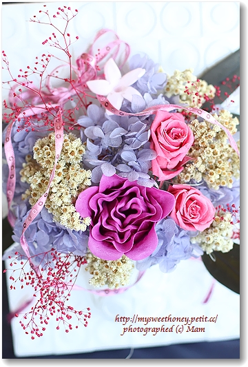 生花の美しさと華やかさもステキですが、プリザは枯れないので 生花とプリザが