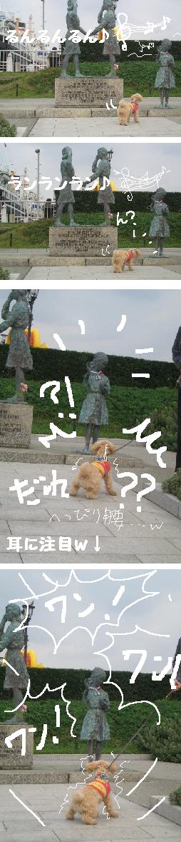 突然、銅像の存在に気付き吠えまくる2005年の1歳になる前の、パピーいっちゃんでした。(笑)